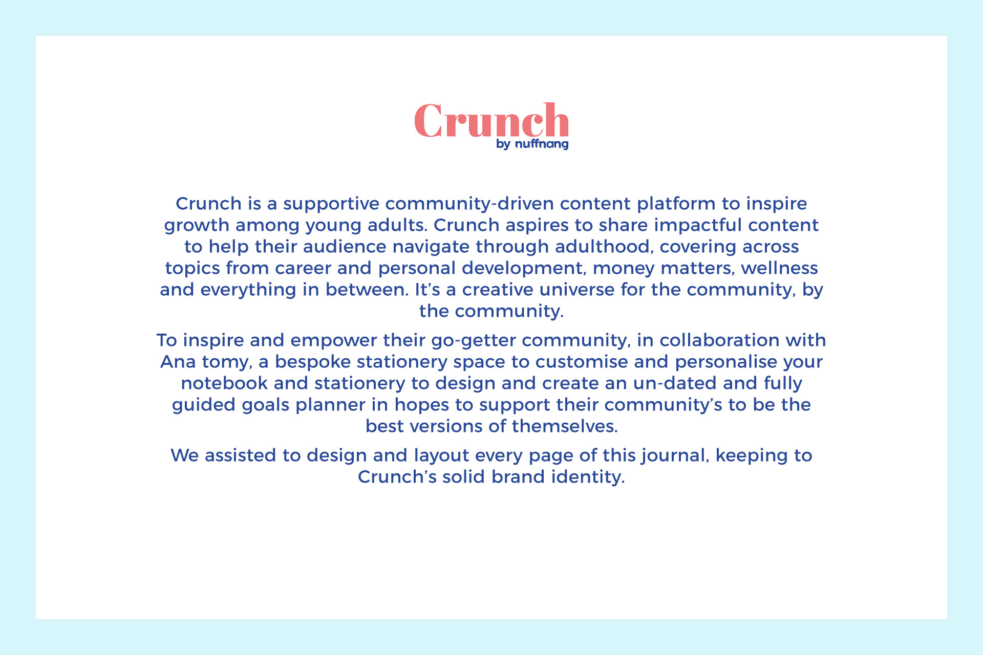 This is a collaboration between Crunch by Nuffnang and Ana Tomy to create a goal-based journal. Created all the journal layout design and customised sticker pack, all encapsulating Crunch's branding.