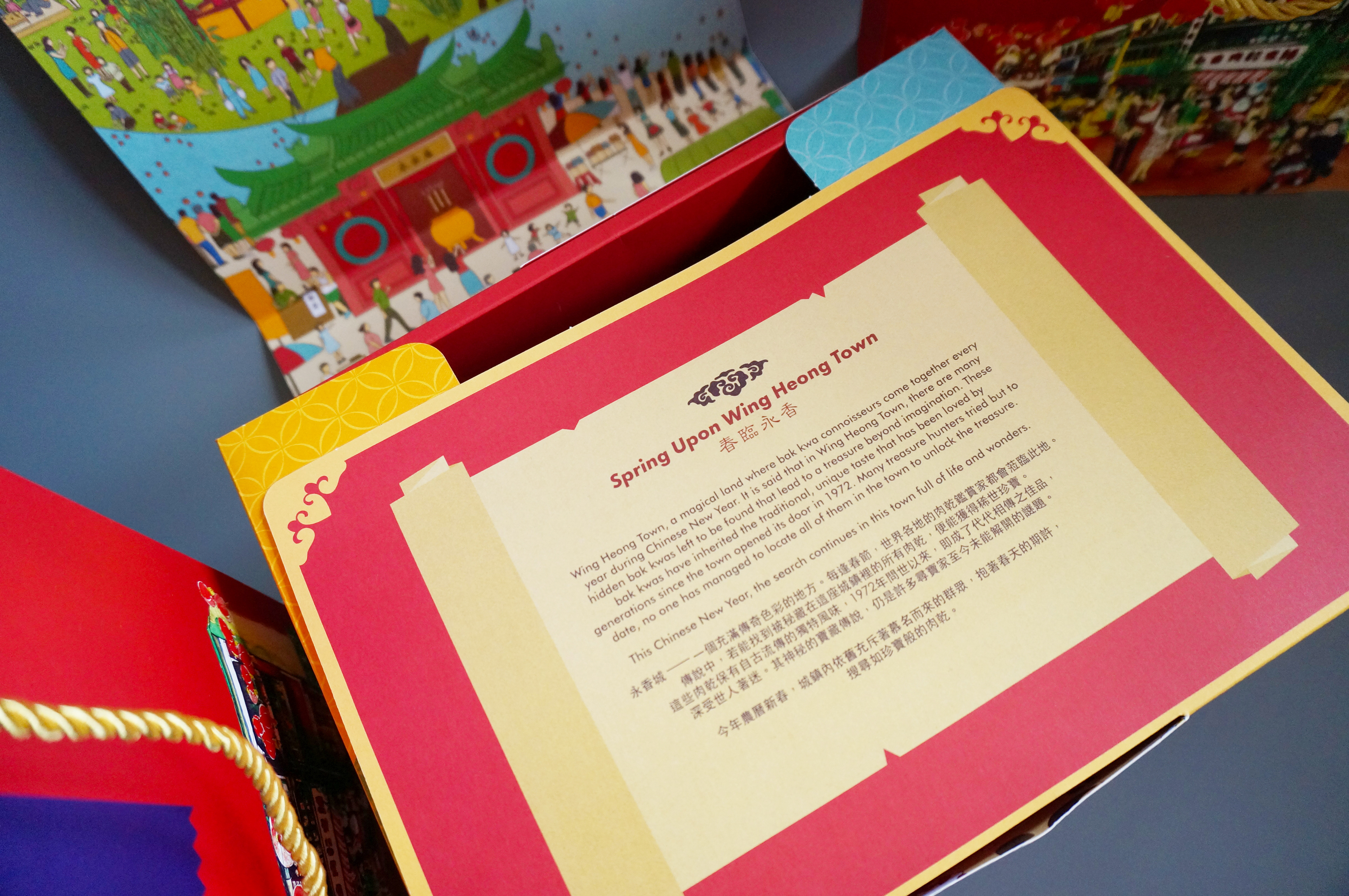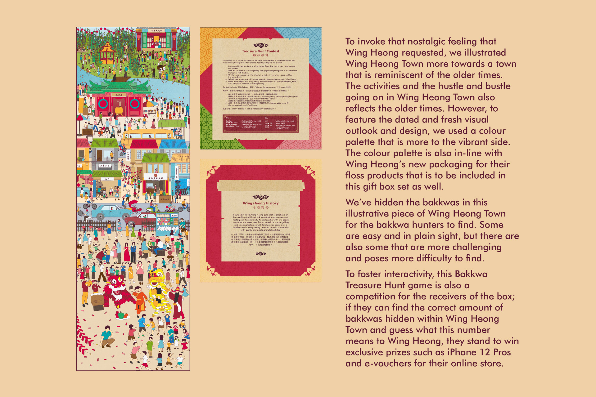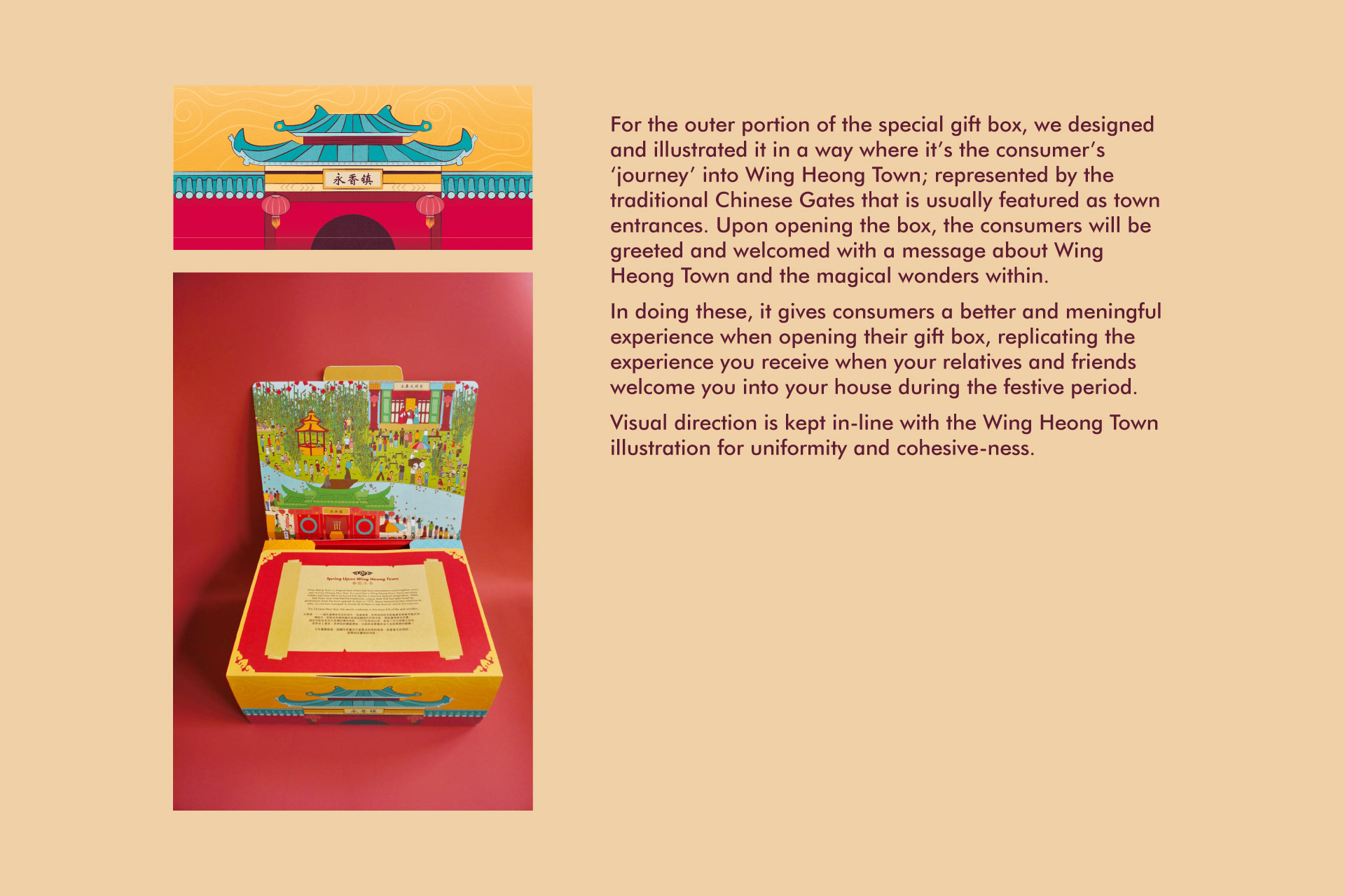 We created a customised CNY giftbox design that encapsulates and brings the users on a Wing Heong adventure. The fictional Wing Heong Town featured in the box are all hand drawn for the added touch of familiarity.